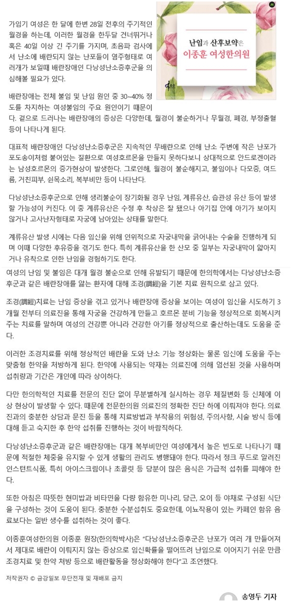 [금강일보 07/26] 난임의 원인이 되는 다낭성난소증후군, 한의원 통한 치료로 개선 가능