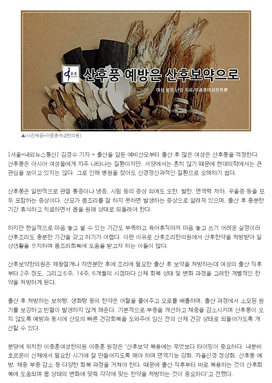 [내외뉴스통신 03/15] 산후한약·산후보약 산후풍 예방을 위한 단계적 처방
