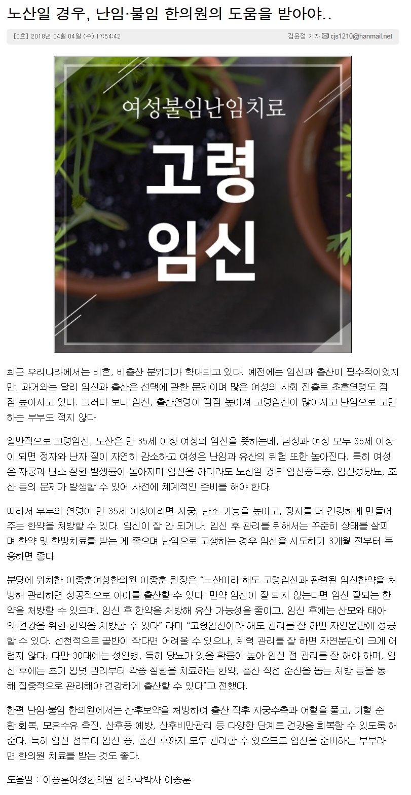 [이투뉴스 04/05] 노산일 경우, 난임·불임 한의원의 도움을 받아야..